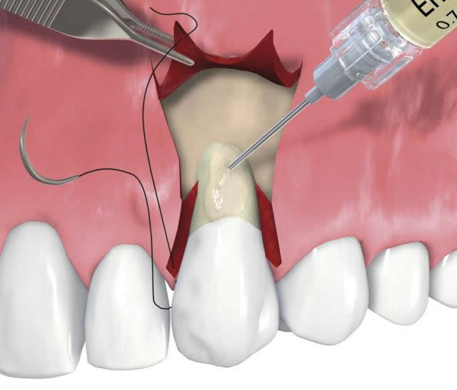 Mi koristimo koštano zamjenjujuće preparate, membrane i ponekad gingivne transplantate. Cijeli proces se zove menagement mekih tkiva.